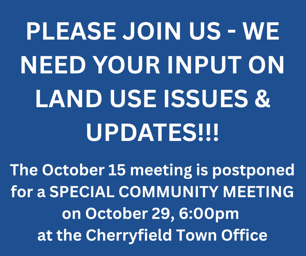 Contact us with land use related questions, concerns, ideas, or to get on the meeting agenda, at CherryfieldPlanningBoard@gmail.com
